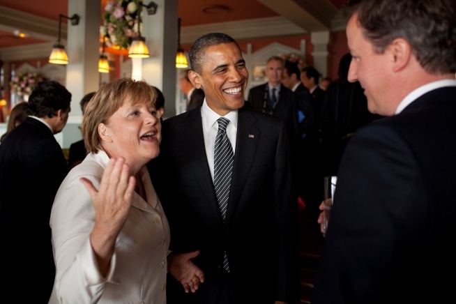 Informelles Gespräch zwischen Angela Merkel, Barack Obama und David Cameron am Rande des G8-Gipfels in Deauville (Frankreich), Mai 2011.