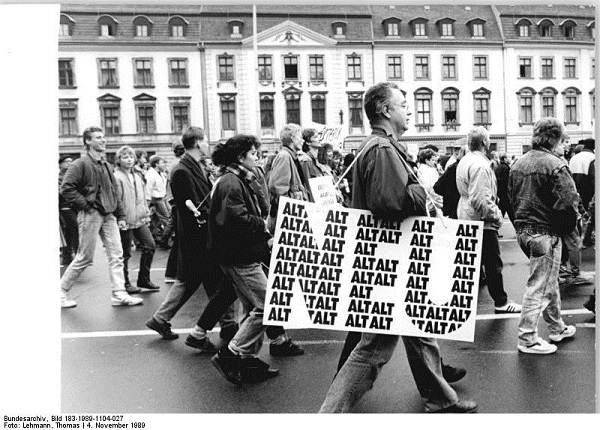 DDR-Bürgerinnen und -Bürger auf dem Weg zur Demonstration am 4. November 1989 auf dem Berliner Alexanderplatz, bei der sich auch viele Kunst- und Kulturschaffende einfanden. Die auf der Kundgebung vertretenen Ideen, in der DDR solle der demokratische Sozialismus entwickelt werden, wurden nur wenige Tage später von der Geschichte überholt. Geblieben ist die Frage, wie eine gute und gerechte Gesellschaft gestaltet werden kann. Foto: Thomas Lehmann (Bundesarchiv, Bild 183-1989-1104-027 / CC-BY-SA 3.0)