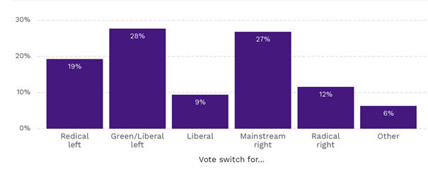 Die größten Wählerwanderungen sind in allen drei Ländern zu progressiven Parteien zu verzeichnen - zu den Grünen in Deutschland, den Liberaldemokraten im Vereinigten Königreich und den Grünen, insbesondere der Grünliberalen Partei, in der Schweiz. Für die Sozialdemokraten noch beunruhigender ist jedoch, dass sie in allen drei Ländern Schwierigkeiten haben, neue Wähler*innen zu gewinnen. Dieses Muster ist bei der deutschen SPD am stärksten ausgeprägt, die ihre Kernwählerschaft verloren hat, ohne Mittel und Wege zu finden, um neue Wähler*innen zu gewinnen.