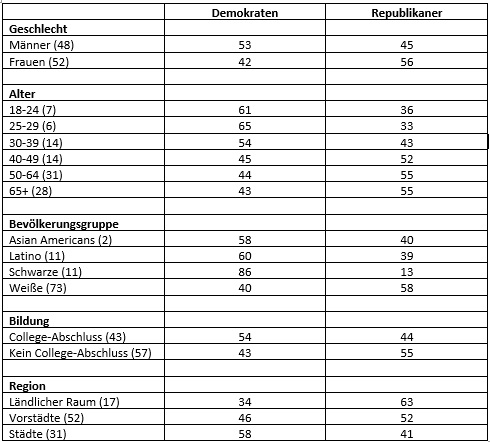 In Bezug auf die strukturellen Merkmale der Wähler*innen von Republikanern und Demokraten zeigten sich bei den Nachwahlbefragungen insgesamt ähnliche Ergebnisse wie bei früheren Wahlen: Die Demokraten punkteten bei jungen Menschen, Frauen, gut Gebildeten, Stadtbewohner*innen und Schwarzen. Die Republikaner waren eher bei Männern, auf dem Land, bei Menschen mit geringerer Bildung und generell bei Weißen erfolgreicher (vgl. die detaillierten Ergebnisse in Tabelle 1).