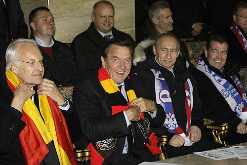 Wie eng sollten die deutsch-russischen Beziehungen sein? Luzhnik-Stadion, Moskau 2009, Fußballspiel zwischen Deutschland und Russland. Im Bild: Edmund Stoiber, Gerhard Schröder, Vladimir Putin und Dmitri Medvedev. Foto: Presidential Press and Information Office (http://eng.kremlin.ru/)Mit der Arbeit des Sonderermittlers Robert Mueller in den USA bleibt die Debatte um (angebliche oder tatsächliche) Eingriffe Russlands im Vorfeld wichtiger Wahlentscheidungen anderer Staaten medial auch ein Jahr nach den Präsidentschaftswahlen weiter präsent. Vor der Bundestagswahl 2017 hörte man immer wieder Warnungen vor ähnlichen Attacken durch in Russland ansässige Hacker, die der Staatsregierung nahestehen sollen. Die grundlegenden Diskussionen um das deutsch-russische Verhältnis, wie sie im Zuge der Auseinandersetzungen in der und um die Ost-Ukraine aufgekommen waren, sind dagegen in der breiteren Öffentlichkeit zuletzt eher verstummt – sieht man einmal von Kommentaren zum umstrittenen Agieren von Altbundeskanzler Gerhard Schröder als Aufsichtsratsvorsitzender der Nord Stream AG und nun auch des Mineralölkonzerns Rosneft ab. Insgesamt ist das Thema wieder mehr auf der Ebene der akademischen Auseinandersetzung angelangt.