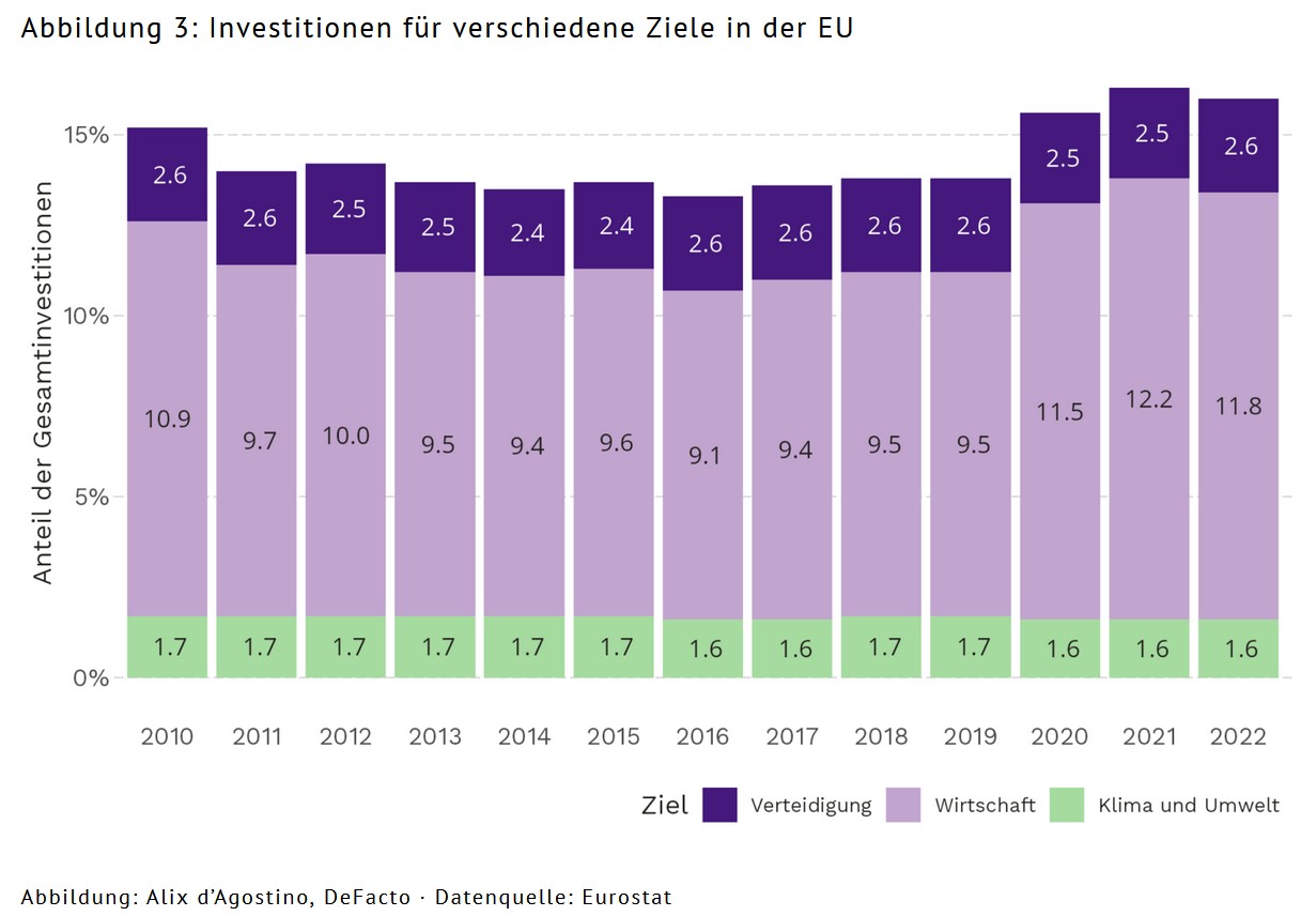 Obwohl diese Frage von entscheidender Bedeutung ist, gibt es keine umfassende Studie, die die Muster staatlicher Investitionen für verschiedene Prioritäten in Europa untersucht. Die Literatur zur ökologischen Finanzierung konzentriert sich beispielsweise ausschließlich auf ökologische Investitionen.[4] Während diese Arbeiten wertvolle Vorschläge zur Steigerung ökologischer Investitionen liefern, analysieren sie nicht, wie ökologische Ziele im Vergleich zu anderen Prioritäten abschneiden. Darüber hinaus wird oft übersehen, dass der ökologische Wandel zwar wichtig ist, aber von staatlichen Akteuren nur als eine von vielen konkurrierenden Prioritäten betrachtet wird.