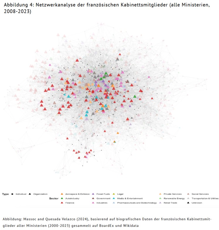 - Die Stärke und Art dieser Verbindungen variiert je nach Regierungsinstitution. Beispielsweise weisen Kabinettsmitglieder in Ministerien tendenziell homogenere Profile auf und sind eng mit dem Finanzsektor, Beratungsunternehmen und traditionellen Industrien verbunden. Abbildung 4 zeigt eine Netzwerkanalyse, die die beruflichen Verbindungen der französischen Kabinettsmitglieder (dargestellt als Kreise) zu verschiedenen Sektoren der französischen Wirtschaft (dargestellt als farbige Dreiecke) veranschaulicht. Deutlich wird die Dominanz individueller Verbindungen zum Finanzsektor (rote Dreiecke) und zu traditionellen Industrien (rosa Dreiecke). Einzelne Verbindungen zur Automobilindustrie (dunkelgrün) und zur fossilen Brennstoffindustrie (dunkelviolett) sind seltener, erscheinen aber im Zentrum des Netzwerks. Im Vergleich dazu sind die Verbindungen zu den Sektoren der erneuerbaren Energien (hellgrün) gering. Im Gegensatz zu diesem Bild der Kabinettsmitglieder weisen die Abgeordneten der nationalen Parlamente eine größere Vielfalt auf, wobei die Bevölkerungsräte den größten Pluralismus aufweisen.