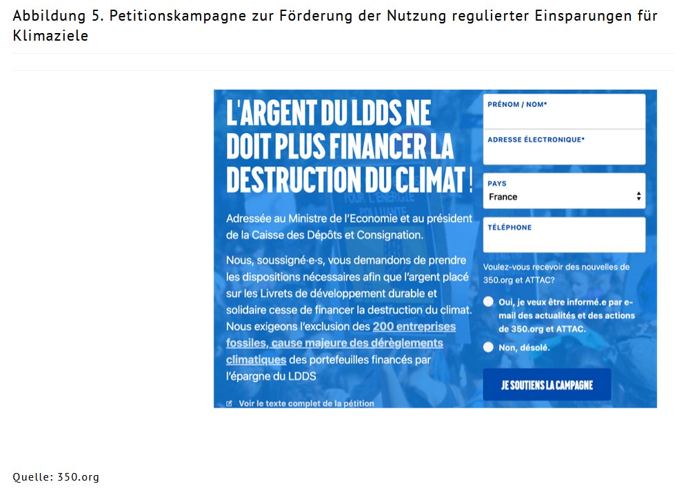 Abbildung 5 zeigt eine Petition, in der die Umwidmung regulierter Ersparnisse für Klimaziele gefordert wird.