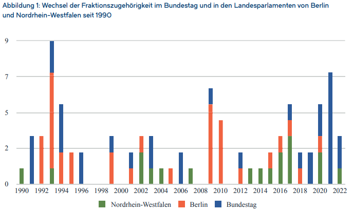 Die Debatte über eine potentielle Abspaltung des sogenannten Wagenknecht-Lagers innerhalb der Linkspartei wird seit mehreren Monaten mit harten Bandagen geführt und erreichte unlängst ihren vorläufigen Höhepunkt mit der Forderung des Parteivorstandes, Sahra Wagenknecht solle ihr Bundestagsmandat zurückgeben. Seit längerem steht mehr oder minder offen der geplante Bruch eines Teils der Linken-Abgeordneten mit ihrer Fraktion im Raum, dem die Partei nun zuvorkommen möchte. Dass Abgeordnete inmitten einer Wahlperiode ihre Fraktion verlassen, ist nach wie vor eher eine Seltenheit in Deutschland, eine parlamentarische Abspaltung umso mehr. Dennoch zeigt ein neuer IParl-Datensatz über die Wechsel der Fraktionszugehörigkeit auf Bundes- und Landesebene, dass in beinahe jeder Wahlperiode der vergangenen drei Jahrzehnte einer oder mehrere Abgeordnete (un-)freiwillig ihre Fraktion verlassen haben.